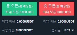 가격과 수량이 정해지면 하단에 위탁비용이라고 해서 위에서 주문 시에 BTC 기준이던 투입금액이 USDT 기준으로 얼마가 투입되는지 확인할 수 있습니다. 그리고나서 상승에 배팅을 할 경우는 롱 오픈을, 하락에 배팅을 할 경우는 숏 오픈을 눌러주시면 됩니다.