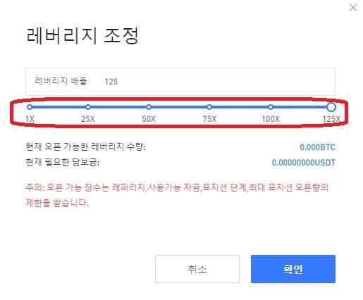 배율은 비트코인의 경우는 최대 125배까지, 알트코인의 경우는 각 코인별 위험성에 따라 20~50배까지 설정이 가능합니다.