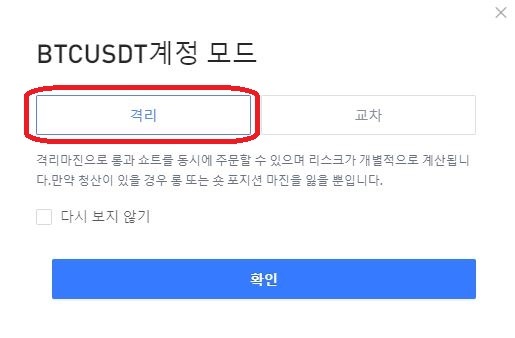 이제 진짜로 롱숏 주문을 넣어볼텐데, 우측 상단을 보시면 교차와 배율이 나와있을 겁니다. 교차를 클릭하면 교차와 격리 중에서 선택을 할 수 있게 되어있는데, 이것에 대한 설명은 아주 중요하기 때문에 별도의 포스팅에서 다루도록 하겠습니다. 일단 초보자는 격리로 하시기 바랍니다.