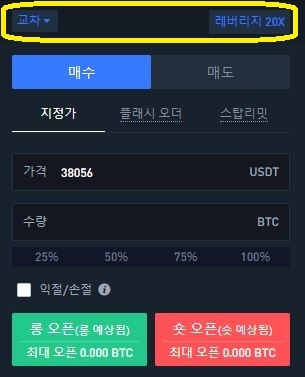 격리교차와 배율을 정했다면 다음으로는 지정가 주문과 시장가 주문 중에서 선택을 해야 합니다. 지정가는 말그대로 아래 가격칸에 지정가를 직접 쳐서 주문하는 방식이고, 시장가는 현재 체결 가능한 가격으로 즉시 주문이 들어가는 방식입니다. 주문수량인 크기는 직접 쳐도 되고 아래의 퍼센트바를 클릭하셔도 됩니다. 어느 거래소든 지정가보다 시장가일 때가 수수료가 좀 더 비싸다는 것을 꼭 알아두시길.