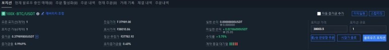 주문이 들어가고 나면 차트 하단에 아래와 같이 포지션이 잡히게 되는데요. 주문을 잡지 못했을 경우는 해당가격이 올때까지 주문 활성화 탭으로 넘어갑니다. 칸별로 하나씩 설명을 드리겠습니다.