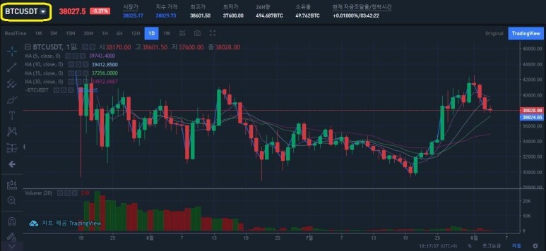 그러면 매매화면에서 들어와있는 상태 그대로일건데요. 좌측상단에 BTCUSDT로 코인 선택이 잘 되어있는지 다시 한 번 확인해봅니다. BTCUSD는 다른 거래이니까 이것저것 건드리다가 틀리지 않게 주의하시기 바랍니다.